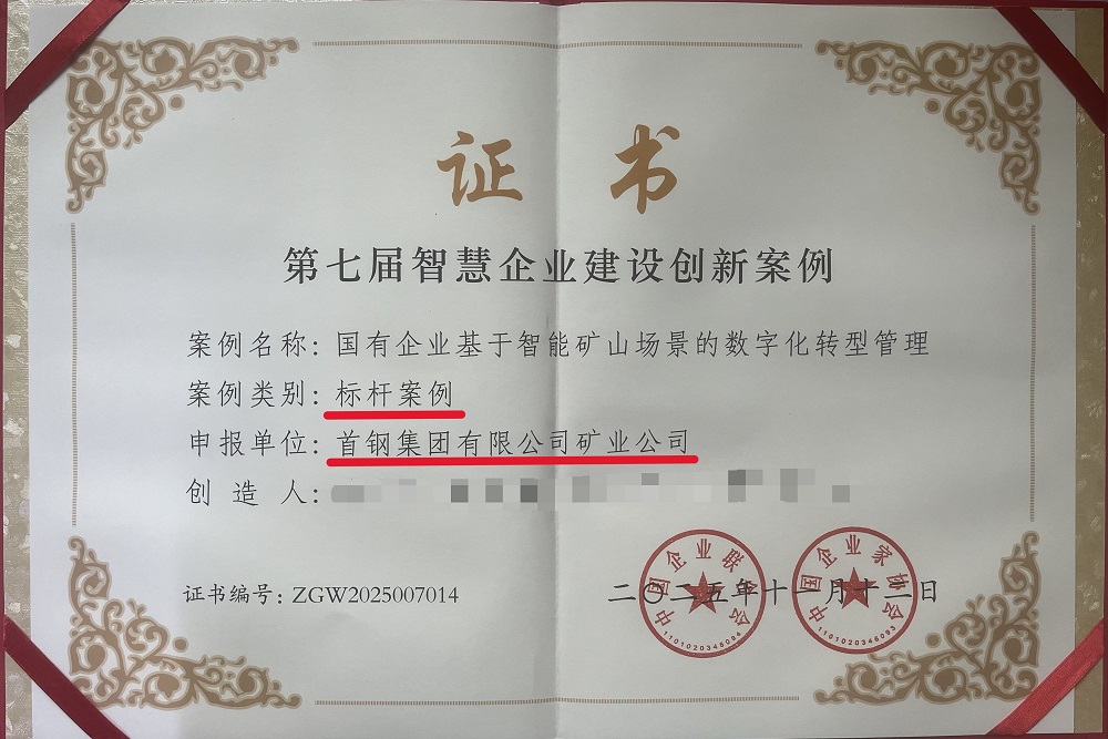 11月25日至26日由中国企业联合会主办的全国智慧企业发展大会上,第七届全国智慧企业建设创新案例正式发布。首钢矿业公司申报的《国有企业基于智能矿山场景的数字化转型管理》案例,从众多参评项目中脱颖而出,获评“标杆案例”(全国共35项),成为冶金矿山领域数字化转型的典范。