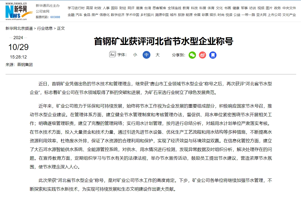 此次荣获“河北省节水型企业”称号,是对矿业公司节水工作的高度肯定。下步,矿业公司各单位将继续加强节水管理,不断探索和实践节水新技术,为实现可持续发展和生态文明建设作出更大贡献。