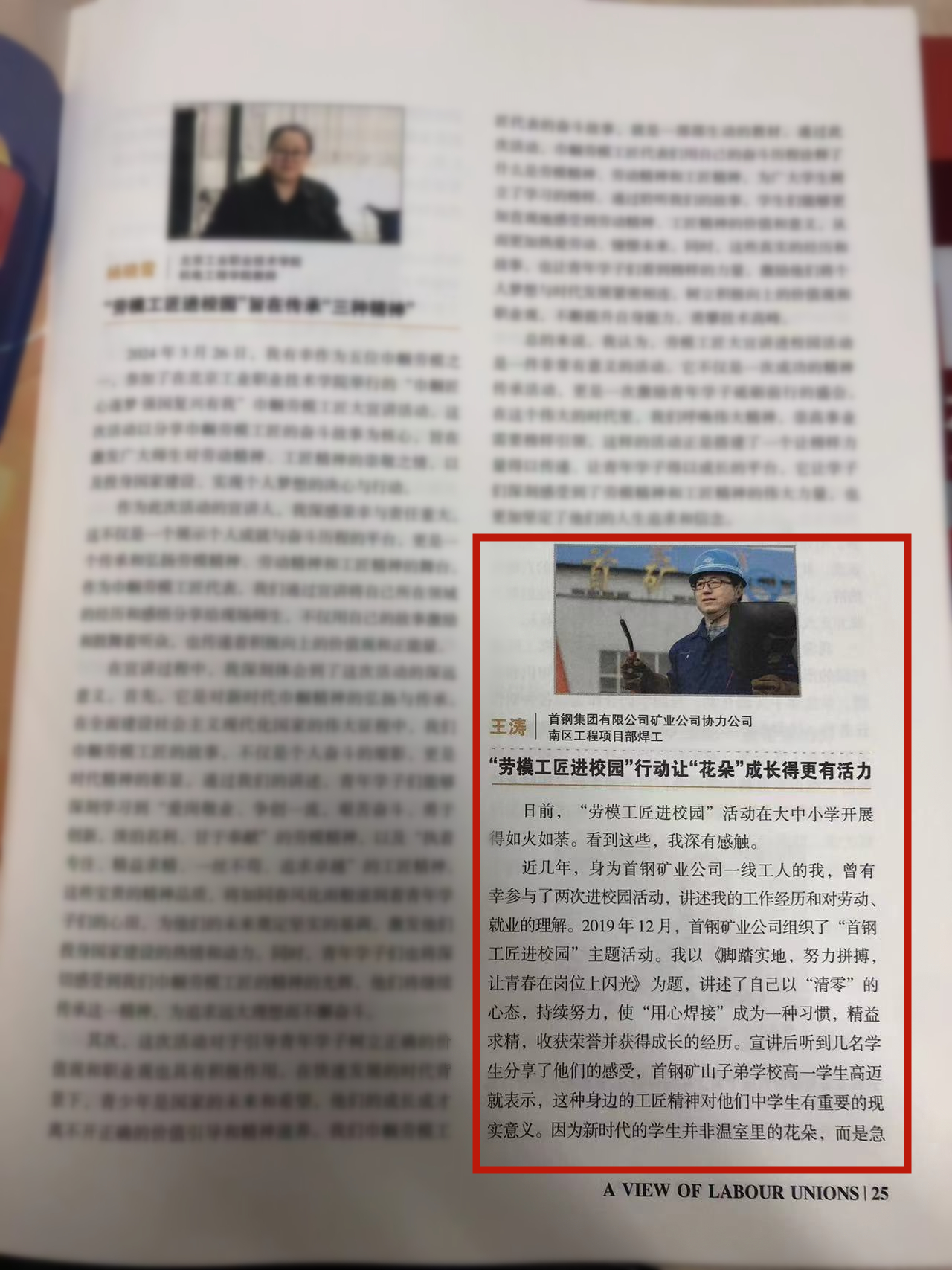 近几年,身为首钢矿业公司一线工人的我,曾有幸参与了两次进校园活动,讲述我的工作经历和对劳动、就业的理解。2019年12月,首钢矿业公司组织了“首钢工匠进校园”主题活动。我以《脚踏实地,努力拼搏,让青春在岗位上闪光》为题,讲述了自己以清零的心态,持续努力,使用心焊接成为一种习惯,精益求精,收获荣誉并获得成长的经历。宣讲后听到几名学生分享了他们的感受,首钢矿山子弟学校高一学生高迈就表示这种身边的工匠精神对我们中学生有重要的现实意义。因为新时代的学生并非温室里的花朵,而是急需淬炼的钢材,而工匠精神正是那熊熊的烈火,不断淬炼、锻造他们。他们的感受让我重新审视了自己的工作,也更加坚信了踏实劳动的可贵。