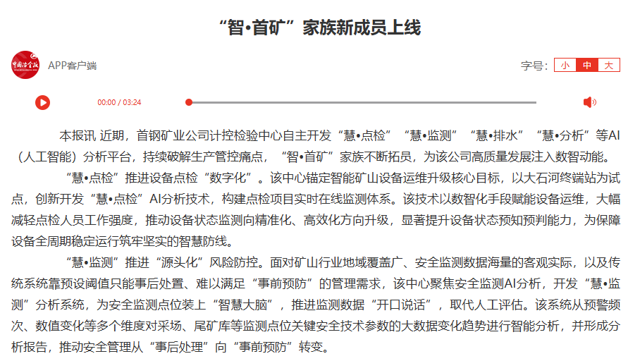 首钢矿业公司计控检验中心自主开发“慧•点检”“慧•监测”“慧•排水”“慧•分析”等AI(人工智能)分析平台,持续破解生产管控痛点,“智•首矿”家族不断拓员,为该公司高质量发展注入数智动能。