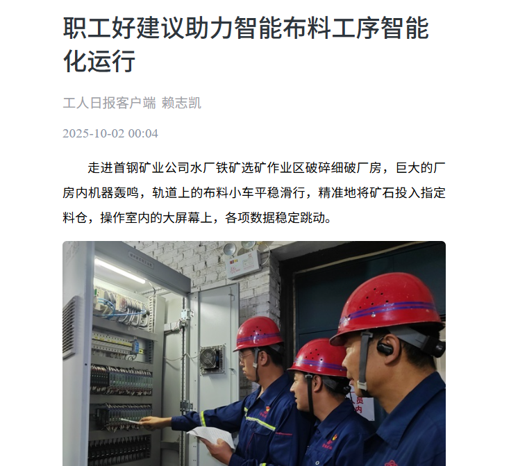 走进首钢矿业公司水厂铁矿选矿作业区破碎细破厂房,巨大的厂房内机器轰鸣,轨道上的布料小车平稳滑行,精准地将矿石投入指定料仓,操作室内的大屏幕上,各项数据稳定跳动。