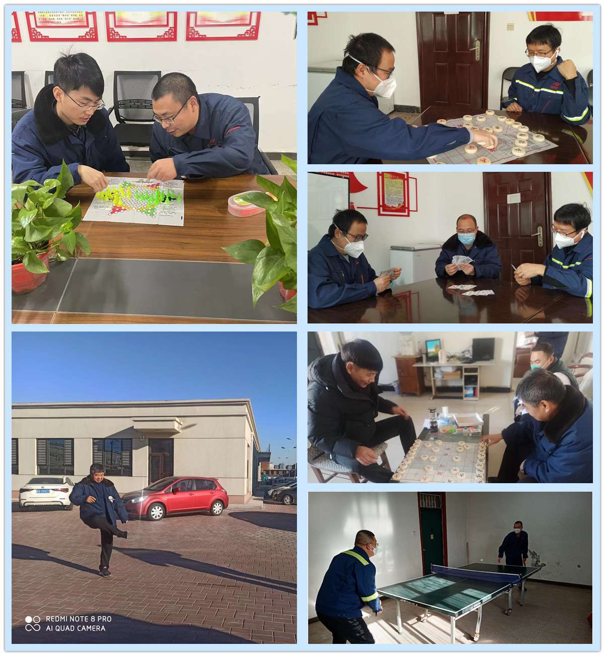 物资公司以车间为单位开展文体活动,30余名职工在同一时间、不同地点,采取斗地主、踢毽子、跳绳、象棋、跳棋、五子棋等多种形式,缓解工作压力,活跃节日气氛,职工们精神饱满、热情洋溢,展现了昂扬向上的精神面貌。